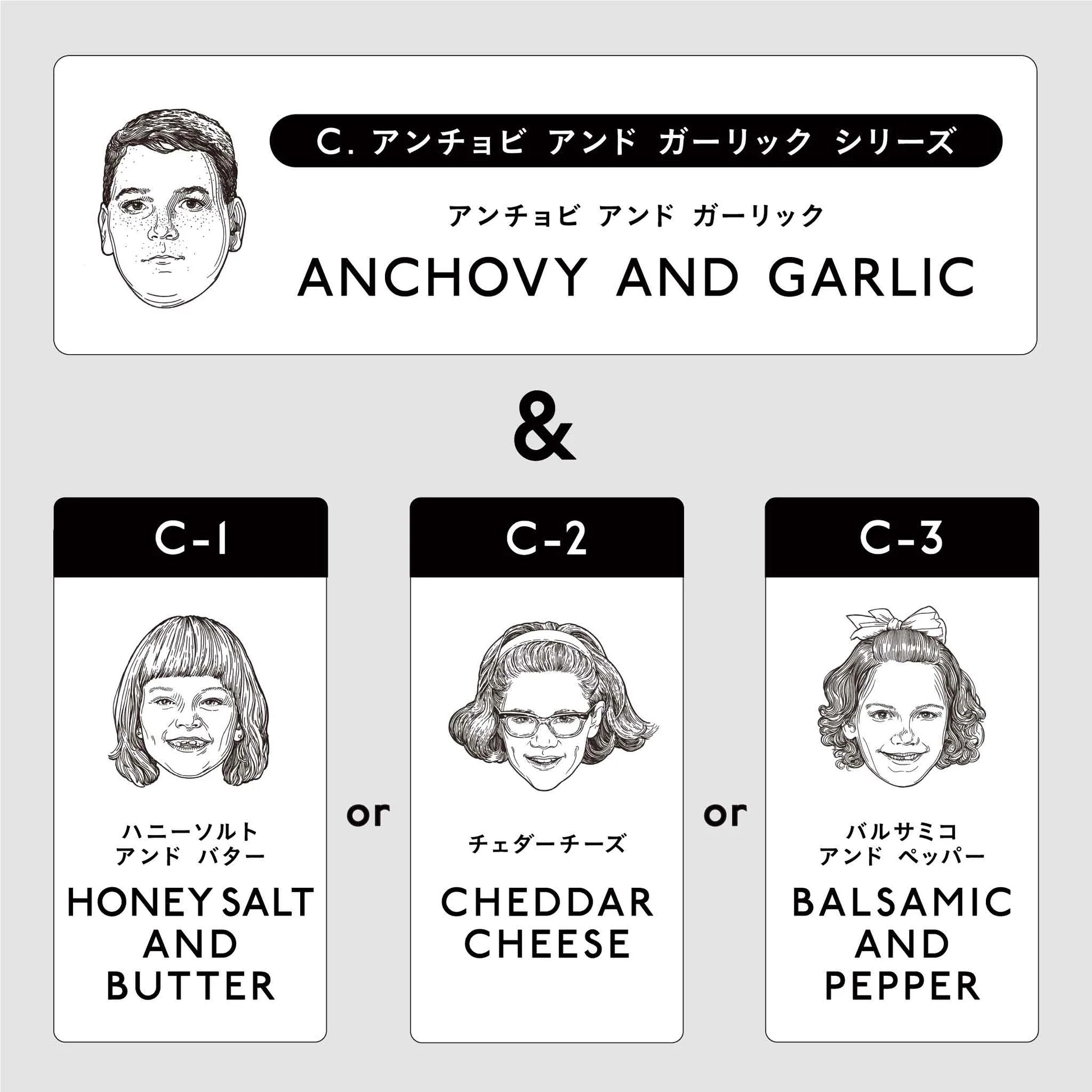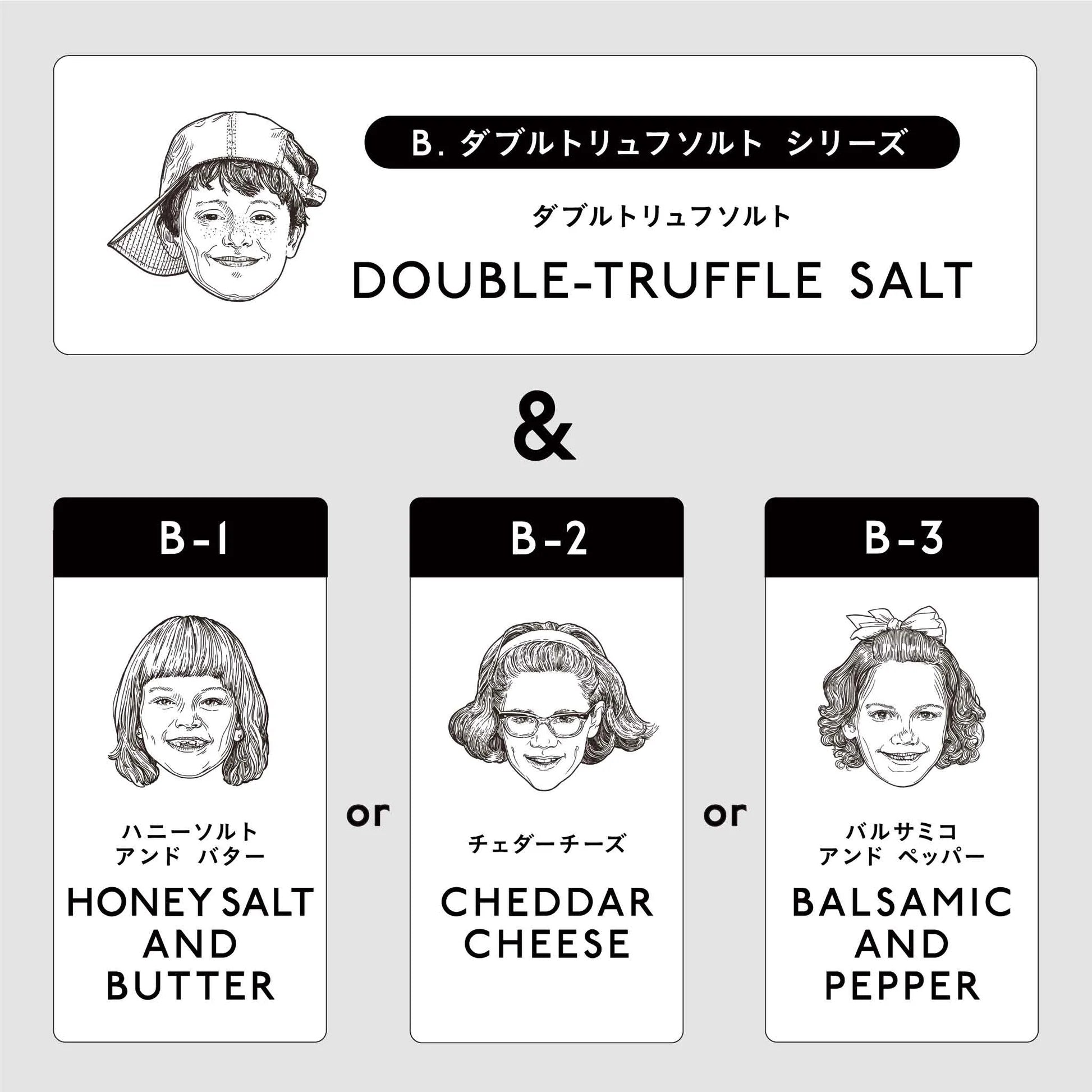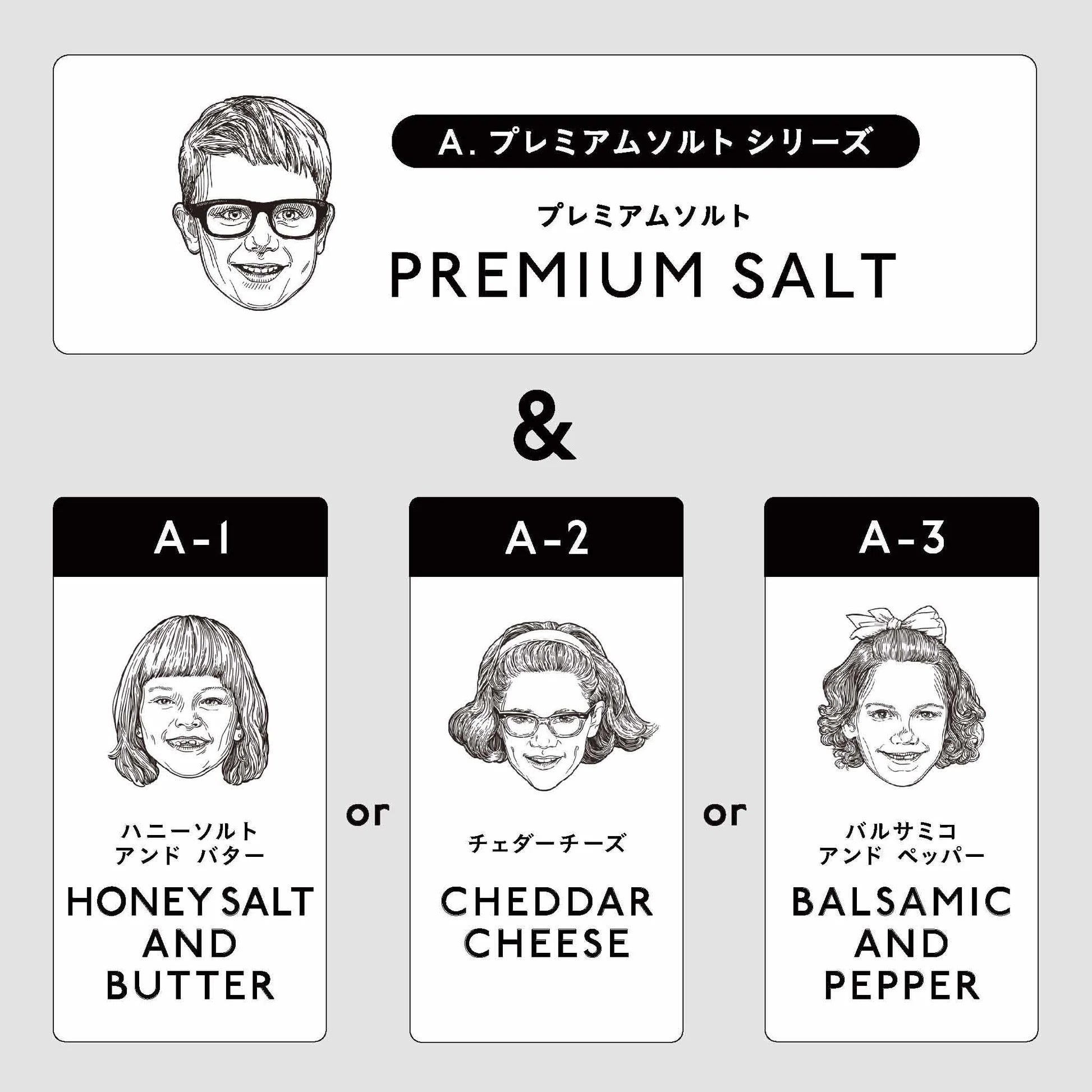 <A-1: Salt & Honey> 1 Premium Salt Mini / 1 Honey Salt and Butter Mini <A-2: Salt & Cheddar> 1 Premium Salt Mini / 1 Cheddar Cheese Mini <A-3: Salt & Balsamic> 1 Premium Salt Mini / 1 Balsamic and Pepper Mini <B-1: Truffle & Honey> 1 Double Truffle Salt Mini / 1 Honey Salt and Butter Mini <B-2: Truffle & Cheddar> 1 Double Truffle Salt Mini / 1 Cheddar Cheese Mini <B-3: Truffle & Balsamic> 1 Double Truffle Salt Mini / Balsamic and Pepper Mini 1 piece <C-1: Anchovy and Honey> 1 Anchovy and Garlic Mini / 1 Honey Salt and Butter Mini <C-2: Anchovy and Cheddar> 1 Anchovy and Garlic Mini / 1 Cheddar Cheese Mini <C-3: Anchovy and Balsamic> 1 Anchovy and Garlic Mini / 1 Balsamic and Pepper Mini |