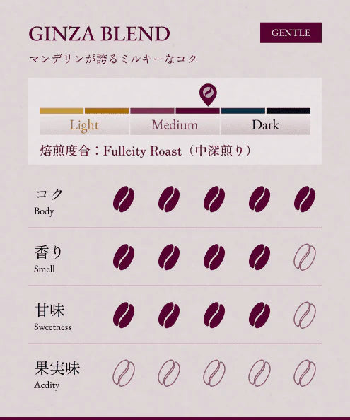 ・GINZA BLEND: A dark roast with a refined balance of bitterness and sweetness