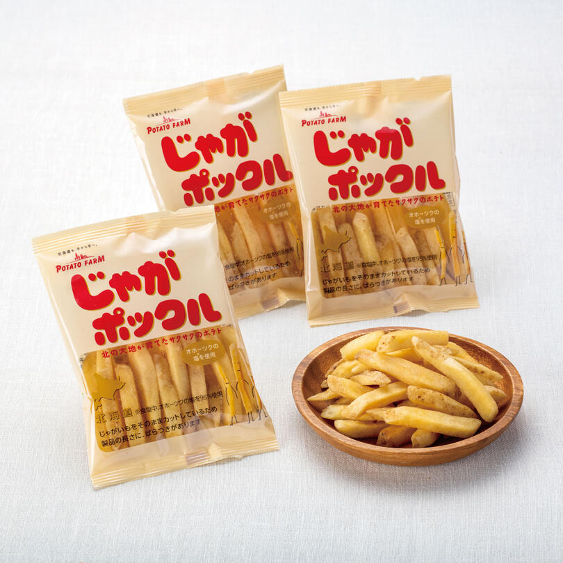 We carefully select large Hokkaido potatoes which are suitable for our manufacturing process. We use whole potatoes with the skin on, to preserve the flavor components. Our original manufacturing process produces a crispy texture and brings out the potato's innate flavor. Also, the salt from Okhotsk is used to create the unique flavor of Hokkaido. This salt is distilled from the brackish waters of Lake Saroma, and slowly cooked to mild salt.